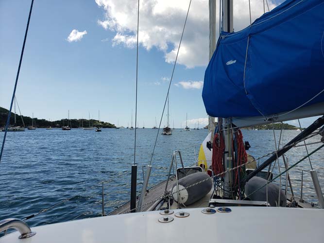 Falmouth does get some swell, and we stayed away from the Southwest side of the harbor. There is good anchoring off the catamaran marina, but there are moorings mixed with anchors and some people actually left their 50ft Lagoon cat at anchor, unattented except for a once or twice a week visit by a gardiennage caretaker.