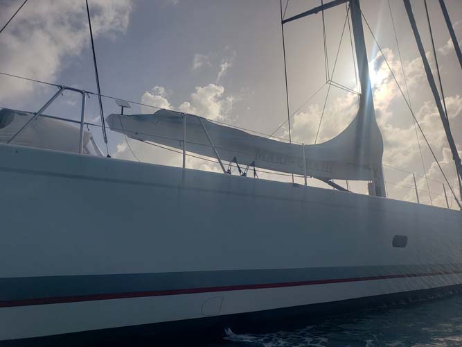 Some noises are not good in a sailboat. Thump, bump, crack and gurgle are examples. I did not wake up immediately but our crew Jhn did, as he was sleeping on the settee. He up instantly, and I very immediately afterward. Lori, Edwin, John, Karen and Drew were up on deck in our skitties trying to assess the situation. We saw a catamaran, nav lights on, with a person at the helm and one person on the trampoline. At first I was incredulous, who after all, would weigh anchor at 1AM? A few words were exchanged, not insults, but I took a firm, annoyed tone, asking why he did not wake us up, and assessed the damage. I found a paint rub, grateful for the limited damage and grateful the night was perfectly calm with no swell. ANswering, he replied: "I tried". John , our crew, is a talented sailor, civil engineer, cyber security consultant, in addition to being a terrific sailor, so fascinated by traditional sailing life that he not only wears the beard to prove it, but added substance and knowledge to the look by taking bosun training on a Lunenberg schooner. John, quick to respond succinctly, said: "Yeah, a second before you hit us!' I was a bit beside myself and asked the other skipper what he was thinking. The man asked if we could move so he could retrieve his anchor. This time I had lost any and all enthusiasm for cooperating. The man asked what to do, again suggesting he could get his anchor if I only got out of the way. "I am not moving one inch at this time, you need to figure out a better plan.". When he proposed releasing 30 more feet of scope, I agreed that we would then stay up 20 minutes and see how the boats settle in the new shore breeze.