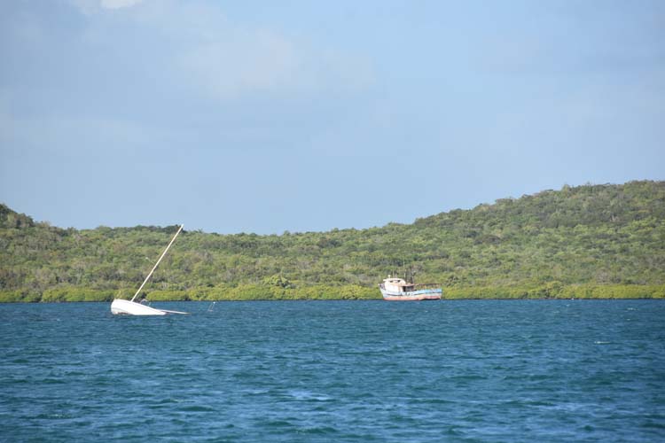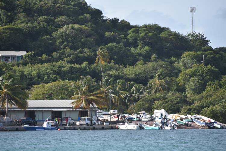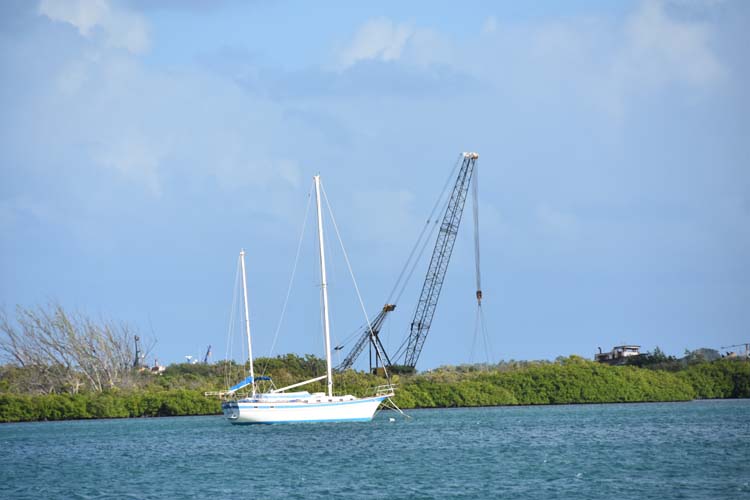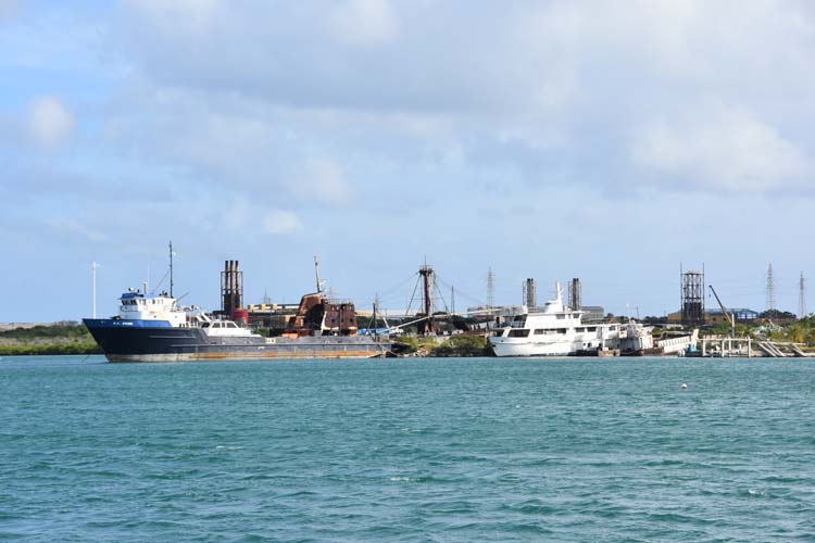On the North side of Antigua is a sheltered bay which hosts the industrial infrastructure. Abandonned boats that sank in some tropical storm, piers hosting decaying old ships which may or may not ever see duty, cranes and recycling piles of stel, an oil refinery and the water desallination plant. We thought we were in New Jersey for a while, but really were not missing the garden state at all. We anchored there because winds were picking up around bird island, and the bay is so sheltered. I don't recommend it as a scenic sopt, but it served an overnight purpose and it was quiet. Watch your depth and proceed with caustion as the bottom comes up fast in some spots and the high spots are wider or somewhat shifted from the chart location. We inched in at one point over an exended sand bar, confident it was not coral but cautious. The bay has a fishing dock on the south side, with a hauling ramp for the skiffs, and an active fishermen business all day. It makes for good binocular watch.