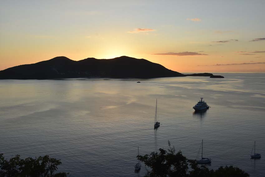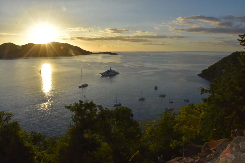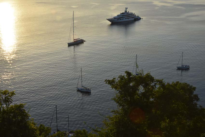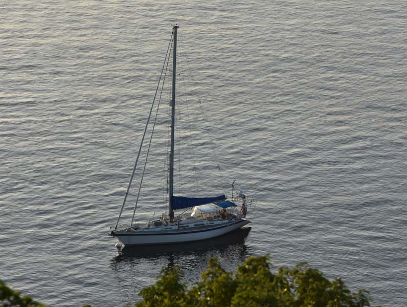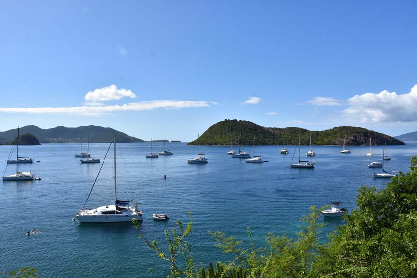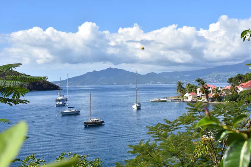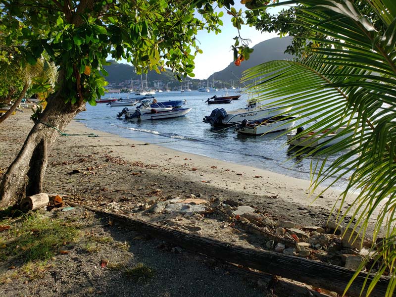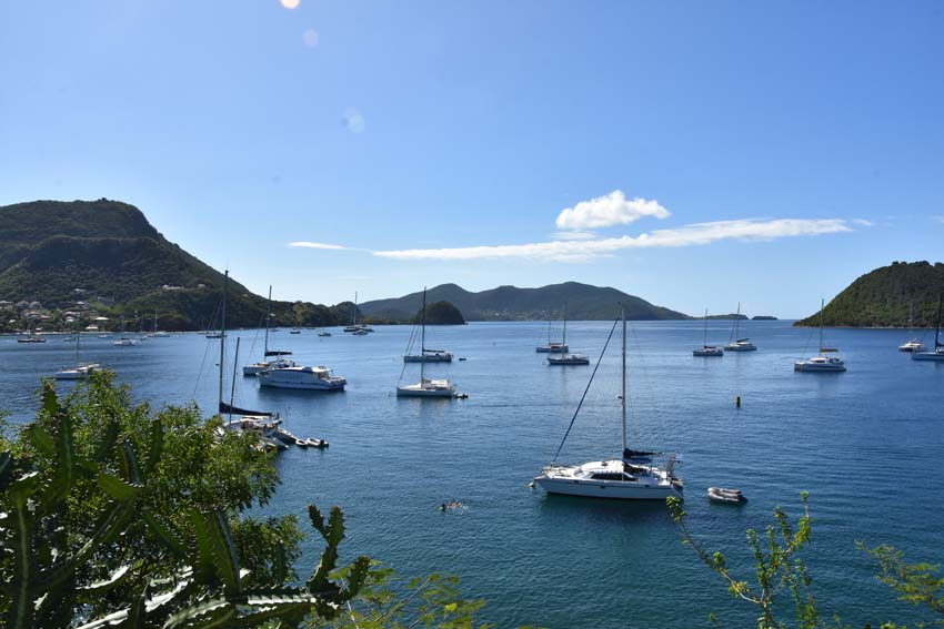 The Anchorage would seem calm in most wind conditions but it is deceiving. We once were surfing down waves in the dinghy when a strong trade wind northeast component was pushing swells into the gap between the islands. The most protected place is at the moorings east of Ilet a Cabrit. The moorings south of Fort Napoleon can get a nasty swell in those types of winds, and the same for the moorings north and west of the town dock.