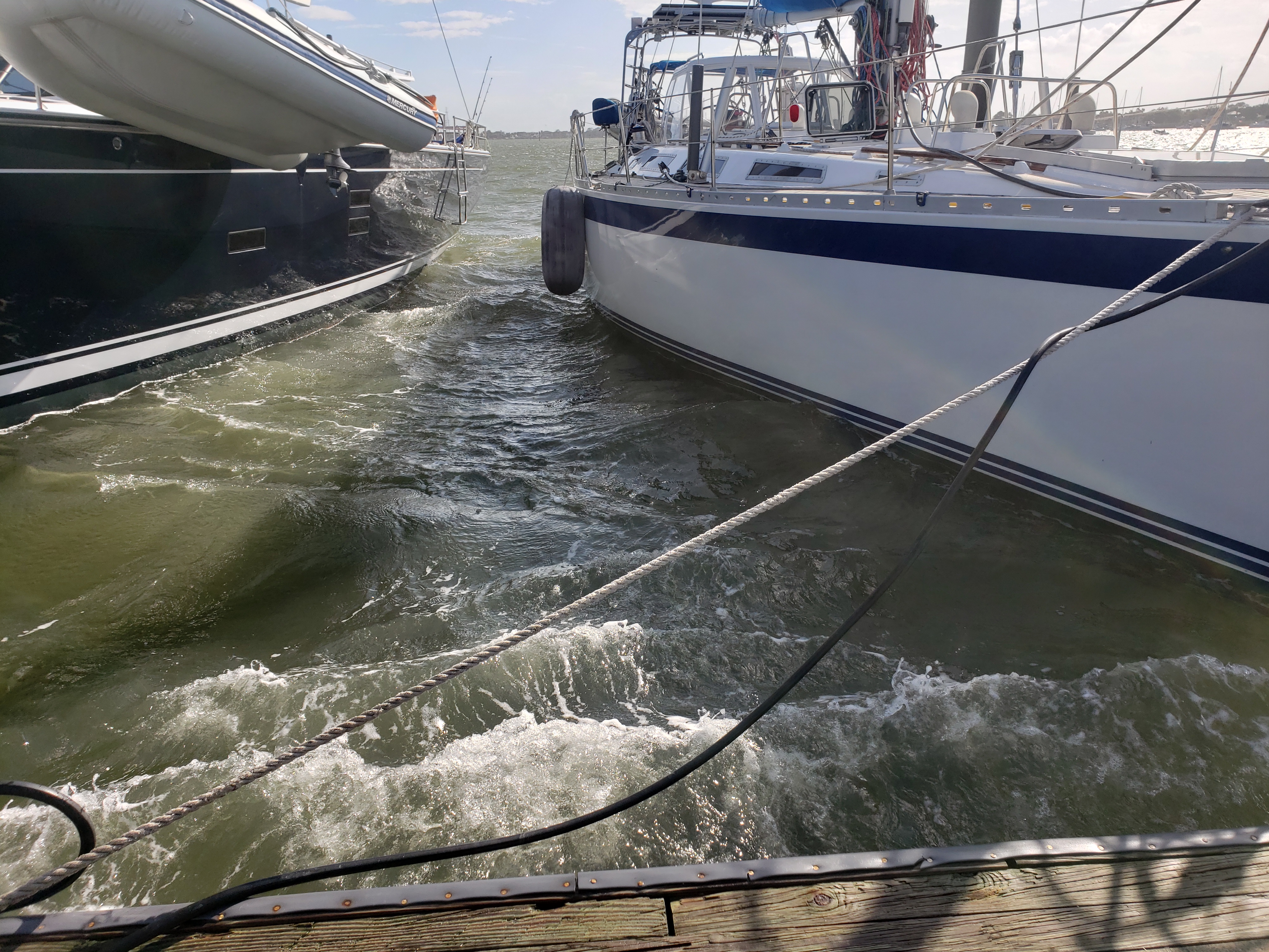 The thrill of docking in a slip with a single screw boat, with a cross wind of 20 knots and current athwartship, watching in sweaty palmed composed panick asthe crew is unable to hold the bow. Wind loads are heavy on a 50 foot boat and this one is less than some more modern designs.