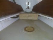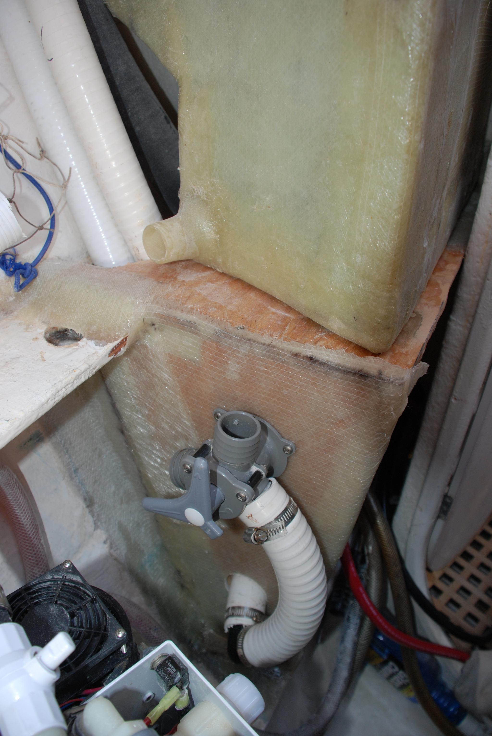 I must say it was audacious to cut the hull, a mistake would have been costly in time and effort. Yet, the work was straight forward fiberglassing with epoxy, once you got over the idea of making two 8 inch giant holes at the bow which could sink your boat in 5 minutes. It took a few weekends to get this done, and I will explain how.The first challenge is that there was a holding tank, and a structural bulkhead which extended slightly above the waterline, in the area where the tunnel should go. So the first step was a new holding tank of fiberglass epoxy, which is compatible with acids, fomaldehyde, sea water, etc. ( I am amazed actually that some manufacturers like Island Packet use aluminum for holding tanks).